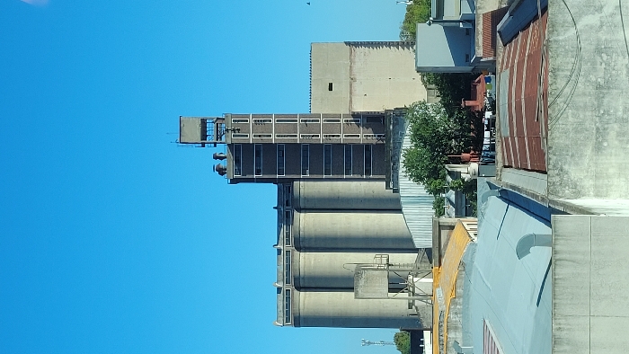 The image displays a large grain elevator complex and surrounding urban rooftops under a clear blue sky, viewed from an elevated perspective