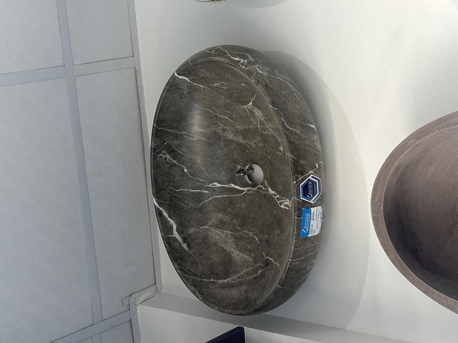 This image depicts an interior scene within a commercial establishment, likely a plumbing or home goods showroom, in Al-Yarmuk, Syria. The primary subject is an oval-shaped countertop basin, made of polished dark gray marble with pronounced white veining, centrally positioned against a plain white wall. A circular metal drain opening is visible at the bottom interior of the basin. Two blue product labels, displaying Arabic text, are affixed to the front rim of the basin. Above, a white drop ceiling with square, textured tiles and a light gray metal grid is visible. Partially seen at the bottom of the frame, below the marble basin, is the upper rim and interior of a second, smaller, bowl-shaped basin, constructed from a solid, unpolished reddish-brown material. No people or overt actions are present in the frame.