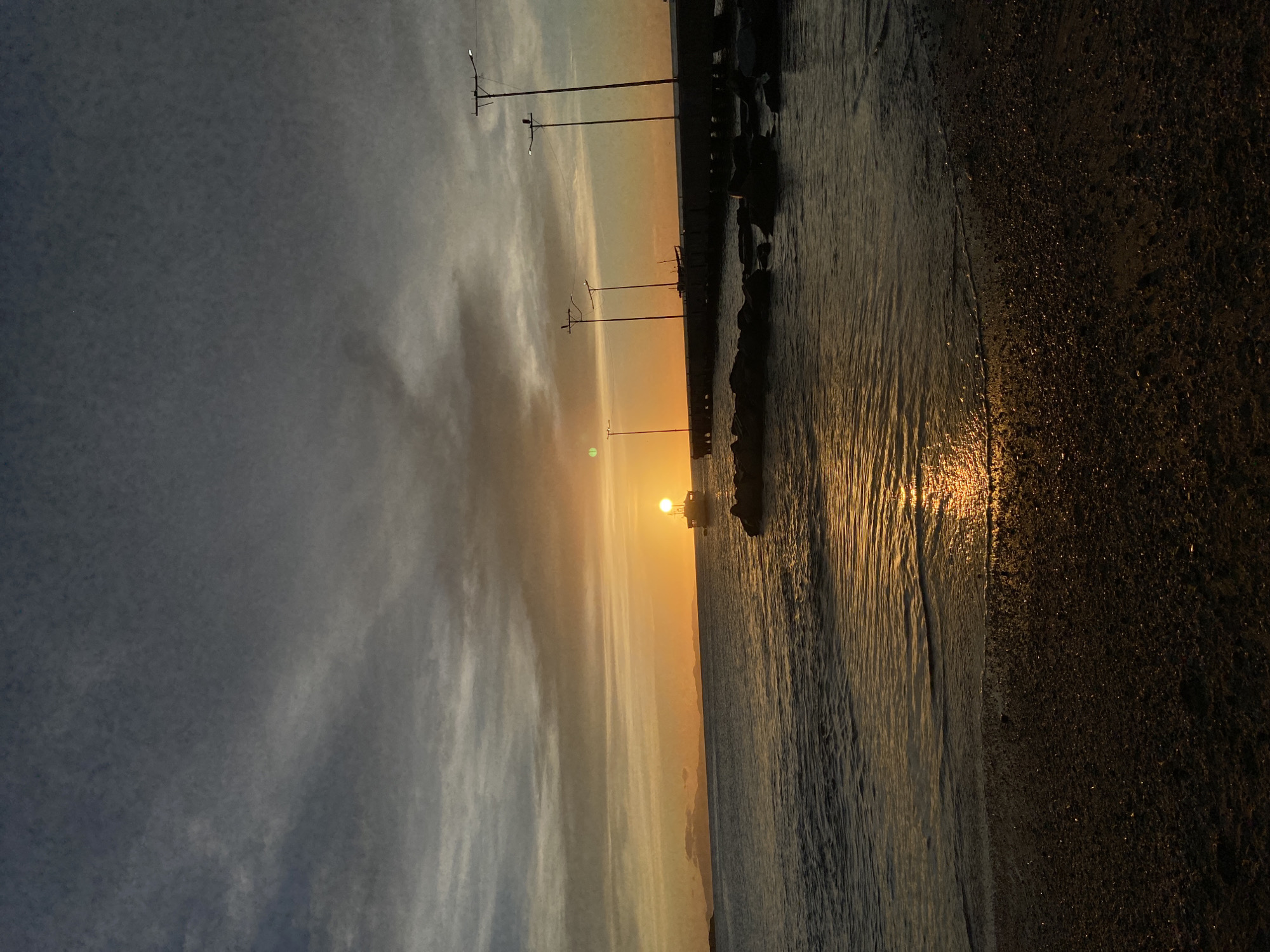 sunset in Juan Griego, Venezuela. The sun is setting over the Caribbean Sea, with a pier on the left side of the image. There are streetlights lining the pier. The foreground shows the beach with a dark colored sand, and the ocean water reflecting the sunlight. The sky is a mix of gray and orange hues.