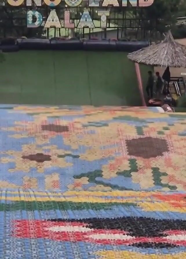 n amusement park called Zongoland Dalat, where people are sliding down a turf slide. The foreground displays a large, colorful tarp. In the background, several individuals can be seen preparing to descend the green turf slide. A thatched-roof structure sits adjacent to the slide, with a few individuals standing underneath it. The backdrop consists of a verdant hill, typical of a park or recreational area.