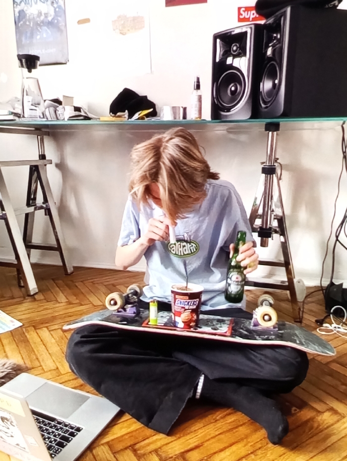 An individual sits cross-legged on a light brown wooden parquet floor in an interior room. The person has light-colored, medium-length hair and wears a light blue t-shirt with a green emblem, dark trousers, and dark socks. They are consuming a dessert from a brown "Snickers" branded container, using a white utensil in their right hand, while holding a green glass "Heineken" beer bottle in their left hand. A dark skateboard is positioned horizontally across their lap, serving as a makeshift tray for the "Snickers" container and a small red tray holding a yellow lighter. An open silver laptop rests on the floor to the person's left. The background features a white wall adorned with several posters, including one displaying a "Supreme" logo and another depicting multiple individuals. A glass-top desk on metal supports holds two black audio speakers on the right and various objects on the left. While specified as Wrocław, Poland, the image provides no distinct visual cues to confirm this precise geographical location.