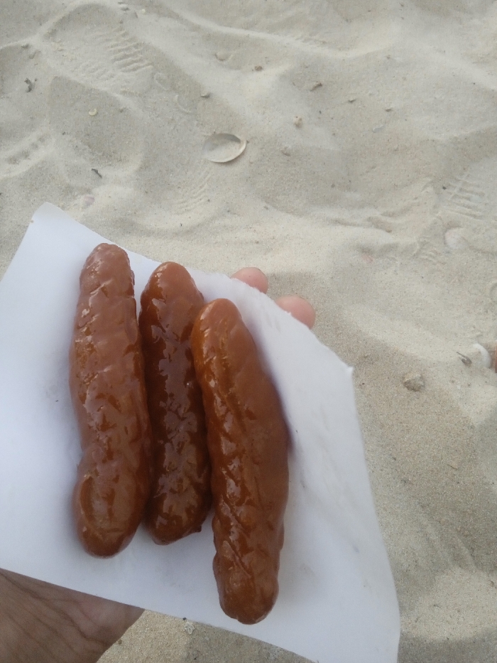 - "A partial human hand is depicted holding three elongated, brown, glazed food items, possibly sausages or fried pastries, wrapped in a crumpled piece of white paper" by FM-cV3b62, licensed under CC BY 4.0