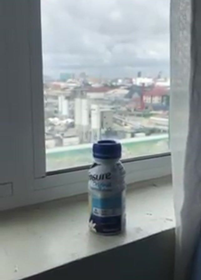 A single bottle of Ensure Original Nutrition Shake sits on a white windowsill, the cloudy cityscape visible through the glass behind it