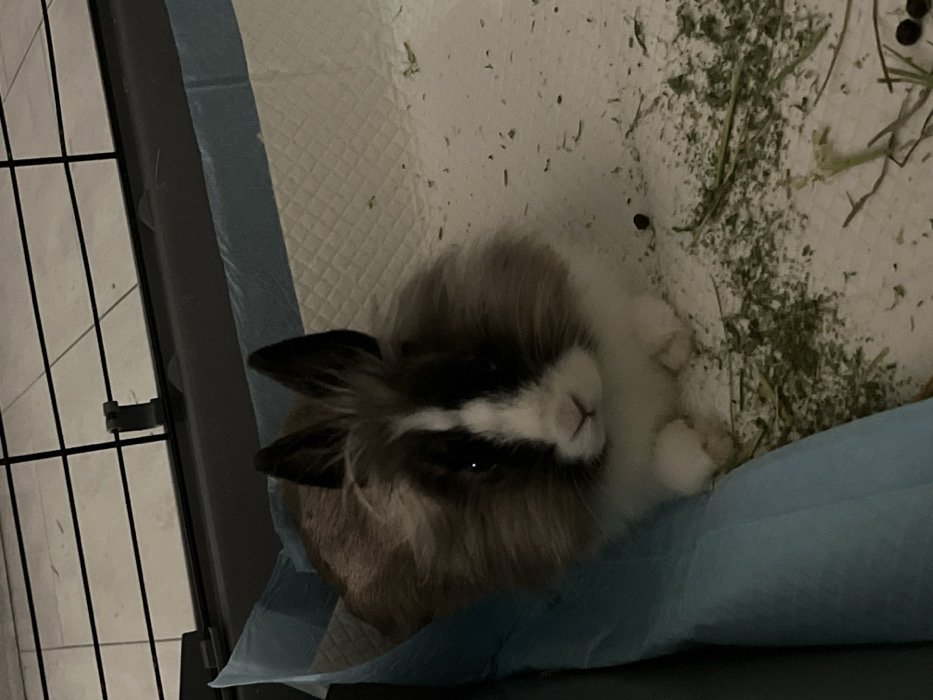 A fluffy rabbit lies in its enclosure. The rabbit has long, dark ears and brown fur with a white stripe across its nose. The enclosure is lined with a puppy pad and scattered hay and pellets. A black wire cage is visible on the left. The rabbit appears comfortable and relaxed.