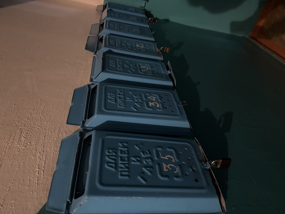 - "The scene presents a row of eight uniform, weathered, teal-colored metal mailboxes affixed to a dark teal wall within an interior space, specifically in Armavir, Russia" by FM-fYcxL2, licensed under CC BY 4.0