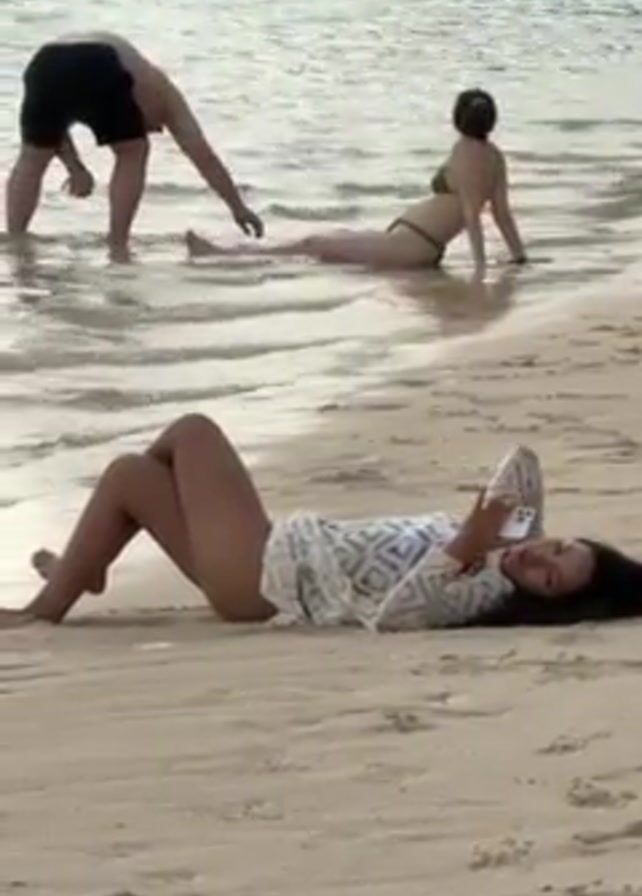 The scene depicts a beach with several individuals. In the foreground, a woman lies on the sand, facing the camera, and looking at her phone. She is wearing a white cover-up with a pattern over what appears to be a swimsuit. In the background, closer to the water, there's a woman in a bikini lying on the sand near the water's edge, and a person bending over the water, their back to the camera, dressed in dark swimwear. There are other individuals in the water further out. The beach has light-colored sand, and the water is clear with subtle waves. The lighting suggests it could be daytime or early evening.