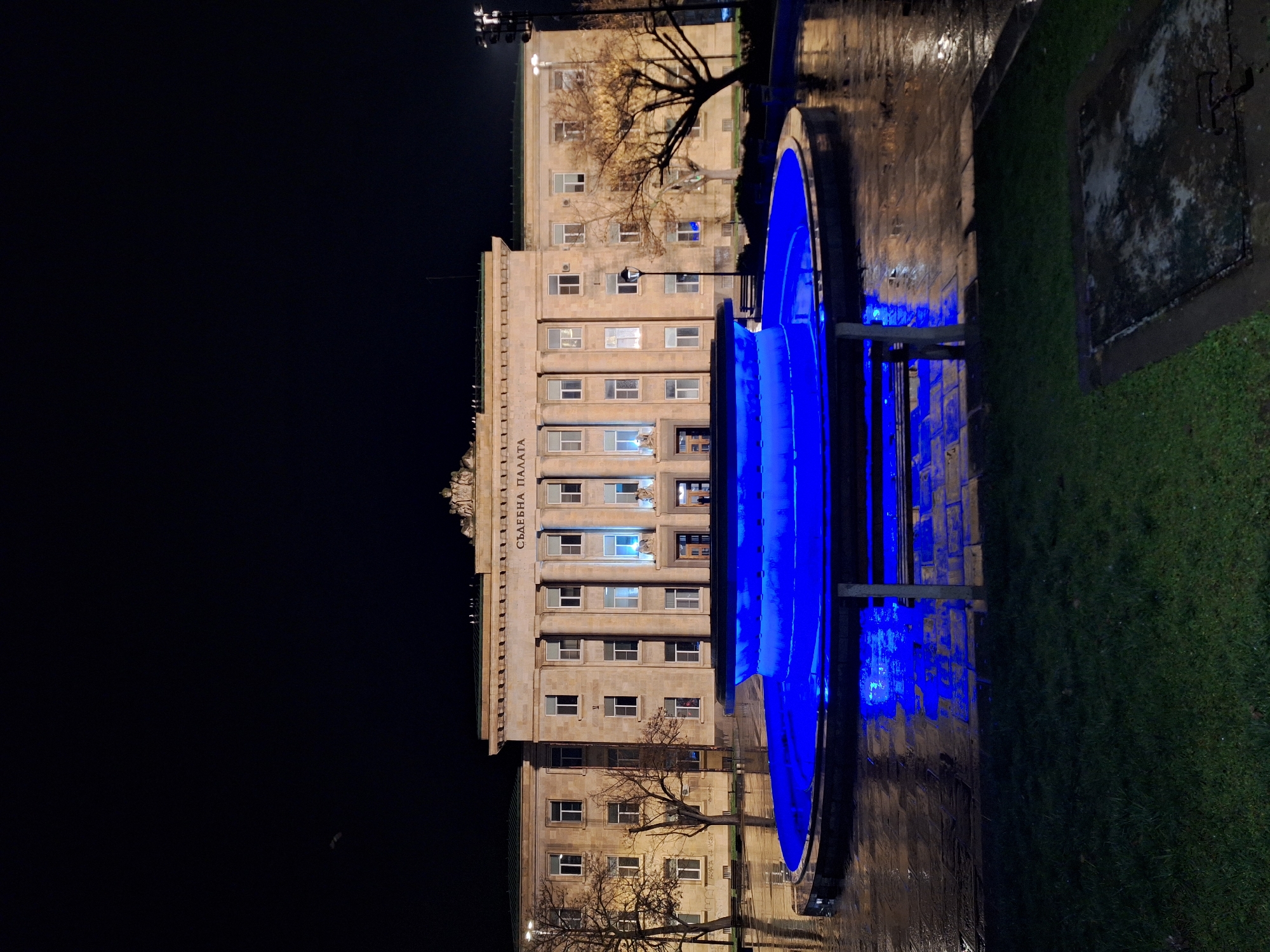 This nocturnal image presents the Courthouse (СЪДЕБНА ПАЛАТА) in Ruse, Bulgaria