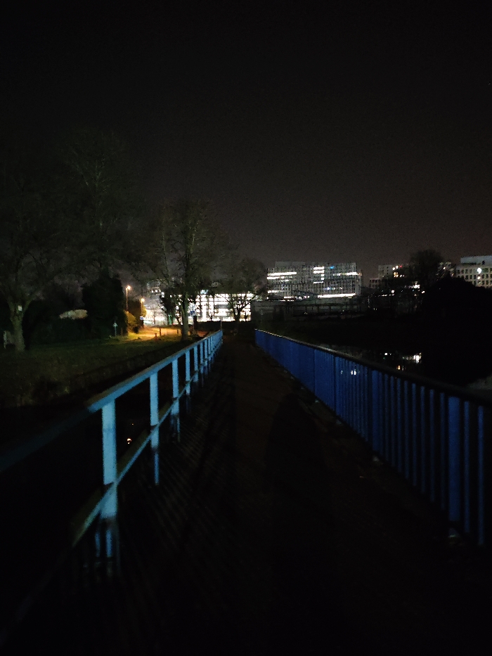 - "The image presents a nighttime scene of a pedestrian bridge in Schiltigheim, France, viewed from a low angle looking forward along its length" by FM-AtXIH2, licensed under CC BY 4.0