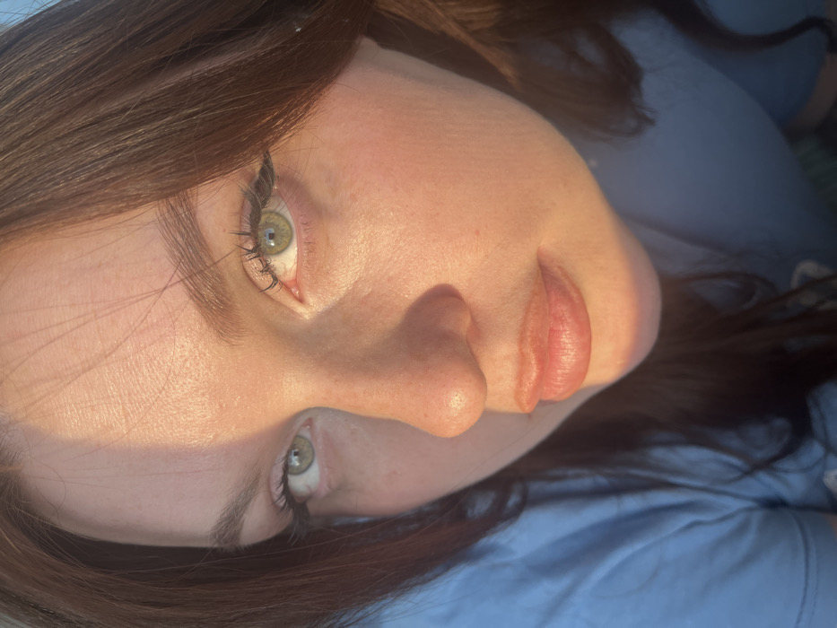 A close-up, high-angle portrait features a female individual with fair skin, dark brown hair, and hazel eyes, directly facing the camera in an indistinct outdoor setting in Павловка, Russia. The subject wears a light blue top. Strong, warm natural light illuminates the right side of her face, creating a shadow line across her nose and left cheek. Her eyes are open with dark eyeliner and mascara. Her lips are full and light pink, slightly parted. Her expression is neutral. No other individuals or specific environmental details beyond natural light are visible.