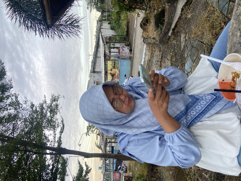 An adult female is depicted seated outdoors in Kalitengah, Indonesia, focused on a light green smartphone held in both hands