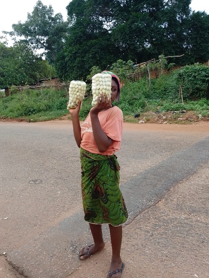 A young female stands on a paved road in Ejule, Nigeria. She wears a peach-colored t-shirt, a green patterned wrapper, and dark-colored flip-flops. A patterned head covering is visible. She holds two large, transparent plastic bags, each filled with numerous small, light-colored, oval-shaped objects, at approximately shoulder to eye level. Her face is partially obscured by the bags. Behind her, dense green vegetation, including large trees and bushes, covers an elevated area. Faint, rudimentary structures are visible within the foliage. The road surface is asphalt with scattered light-colored gravel and dirt.