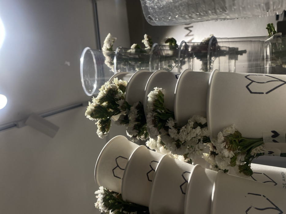 A vertical arrangement of white cups with a sketched heart design, interspersed with clusters of white flowers. Above, transparent plastic cups and containers form another layer. A white wall serves as the backdrop, with a light fixture visible in the corner. The composition is predominantly white and captures a modern, floral aesthetic.