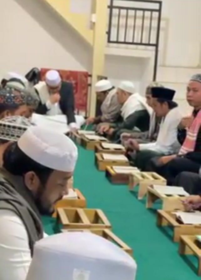 group of men sitting in rows on the floor in what appears to be a room with green carpeting. The men are dressed in religious attire, including various hats and robes, and most of them are reading from books on small wooden stands. The man in the front row on the left has a beard. A man in a suit is sitting at the head of the rows of men. There is a staircase behind them.