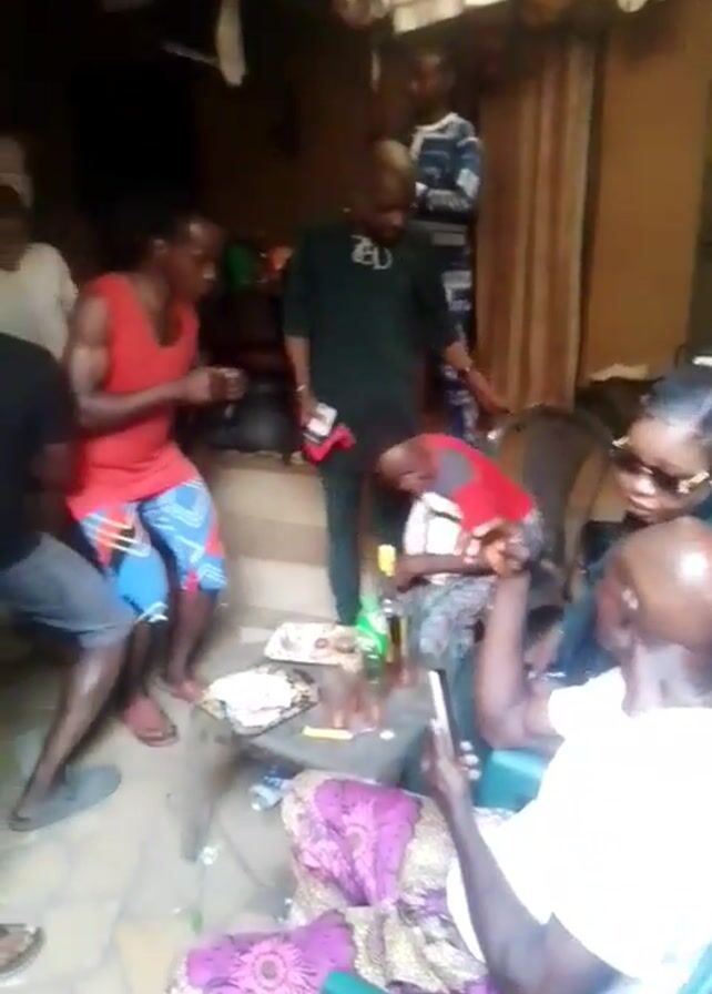 group of people gathered in what appears to be a modest indoor space, possibly a home. The lighting is somewhat dim, and the video is slightly shaky. Several individuals are visible, including men and women of varying ages. Some are wearing casual clothing, while others are dressed in more patterned or colorful attire. A man in a red tank top and patterned shorts is particularly prominent. People are moving around, and some appear to be dancing or gesturing to the music. A table is visible, holding plates, bottles, and other items. One person seated in a green chair appears to be looking at their phone. The overall atmosphere suggests a social gathering, perhaps a party or celebration, though the specific nature of the event is unclear.
