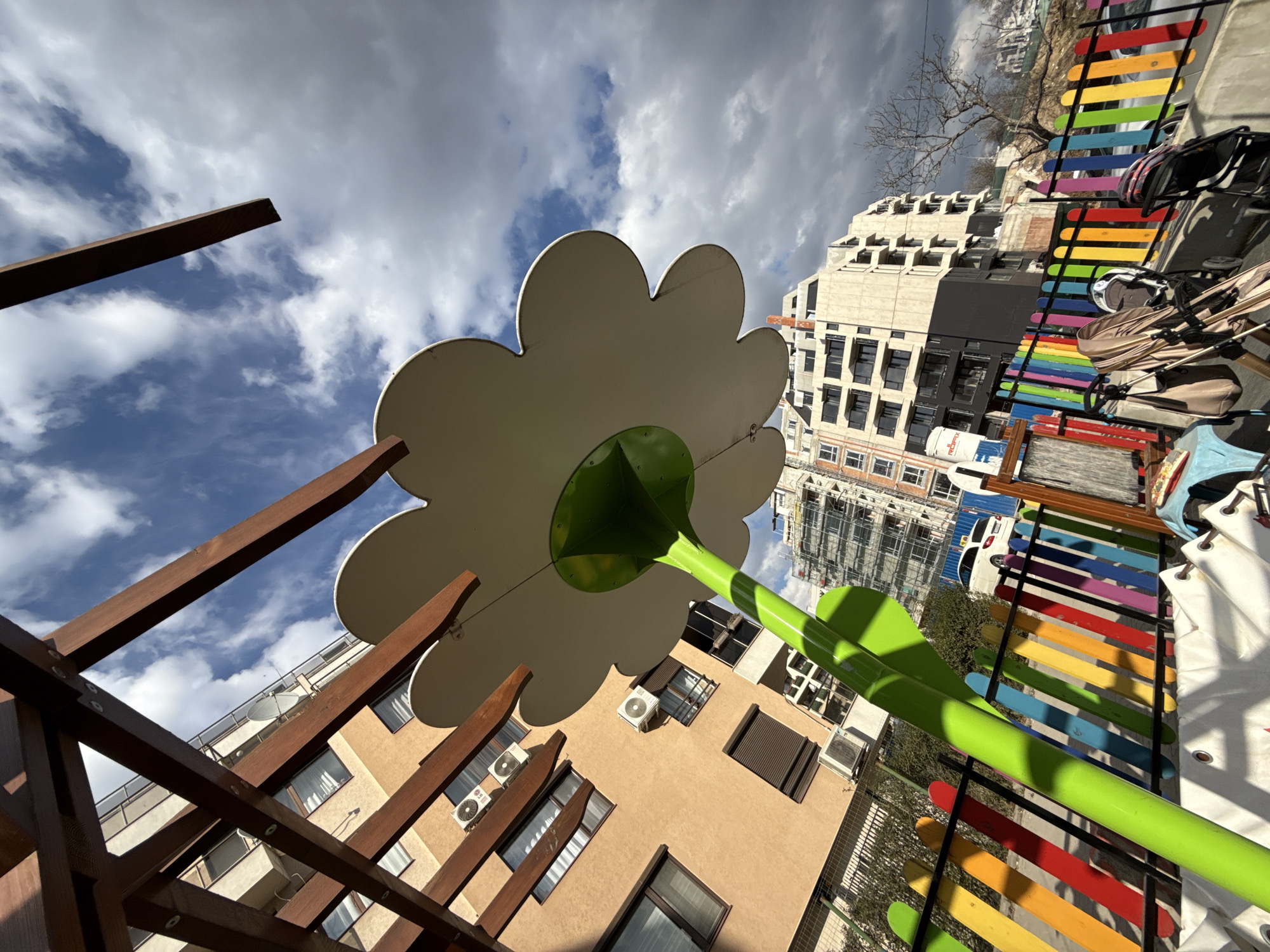 This image depicts an urban outdoor area in Sofia, Bulgaria. A large, stylized white flower canopy with a bright green stem occupies the central foreground, partially beneath dark brown wooden pergola beams. A multicolored slatted fence, featuring vibrant red, yellow, green, blue, orange, and purple panels, stretches across the mid-ground. Behind the fence, two strollers are visible: one beige and collapsed, the other darker and partially obscured. To the immediate left, a multi-story residential building with a light brown facade displays numerous windows and several external air conditioning units. To the right, a multi-story residential building under active construction, with exposed concrete and scaffolding, stands prominent. A bare tree is situated near the colorful fence, and a white sedan is partially visible beyond it. The sky is partly cloudy, with significant white and grey cloud formations against patches of blue. No people are present in the scene.