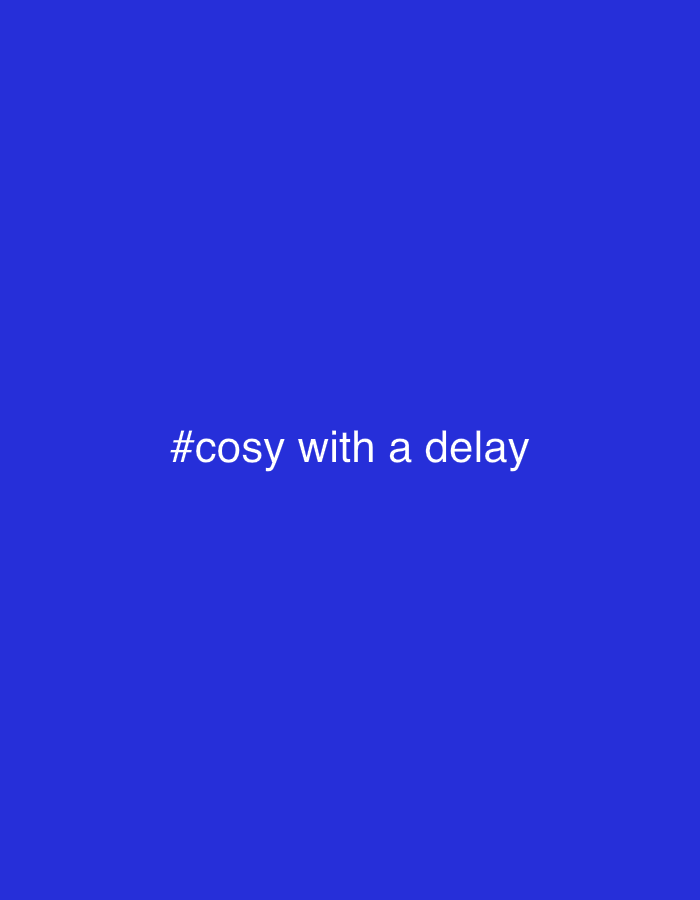 A royal blue square image displays the hashtag "#cosy with a delay" centered in white text