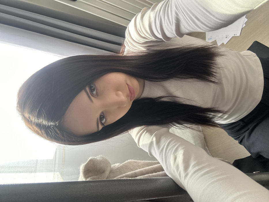 An indoor scene in Nanterre, France, depicts a young adult female positioned centrally, capturing a selfie. She has long, straight, dark brown hair, parted in the middle, and is looking directly into the camera with a neutral expression. She wears a light-colored, long-sleeved top and dark, ribbed trousers. Her arms are extended forward, holding the camera. The background on the left features a bright, backlit window or light source, partially obscured by a dark, vertical structural element and a light-colored, folded textile. To the right, dark vertical blinds or slatted curtains are present. The floor, visible in the lower right, is light-colored wood, upon which several sheets of paper, one lined, are scattered.