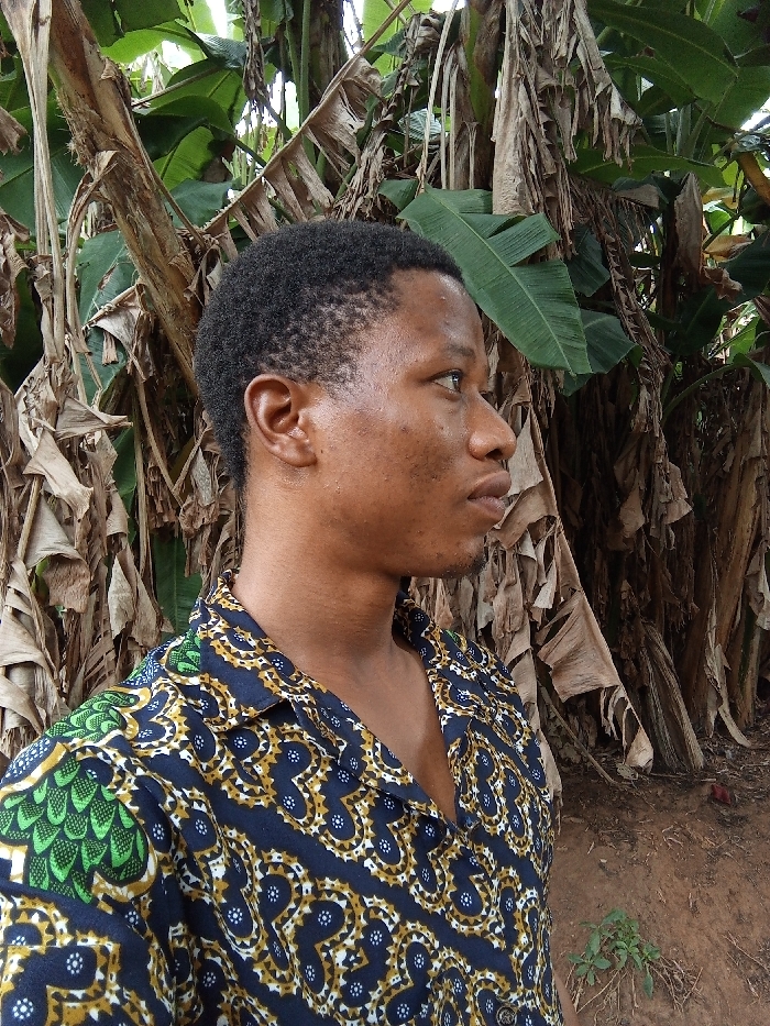 An outdoor profile photograph taken in Aramoko-Ekiti, Nigeria, depicts a young adult male positioned in the foreground, facing right