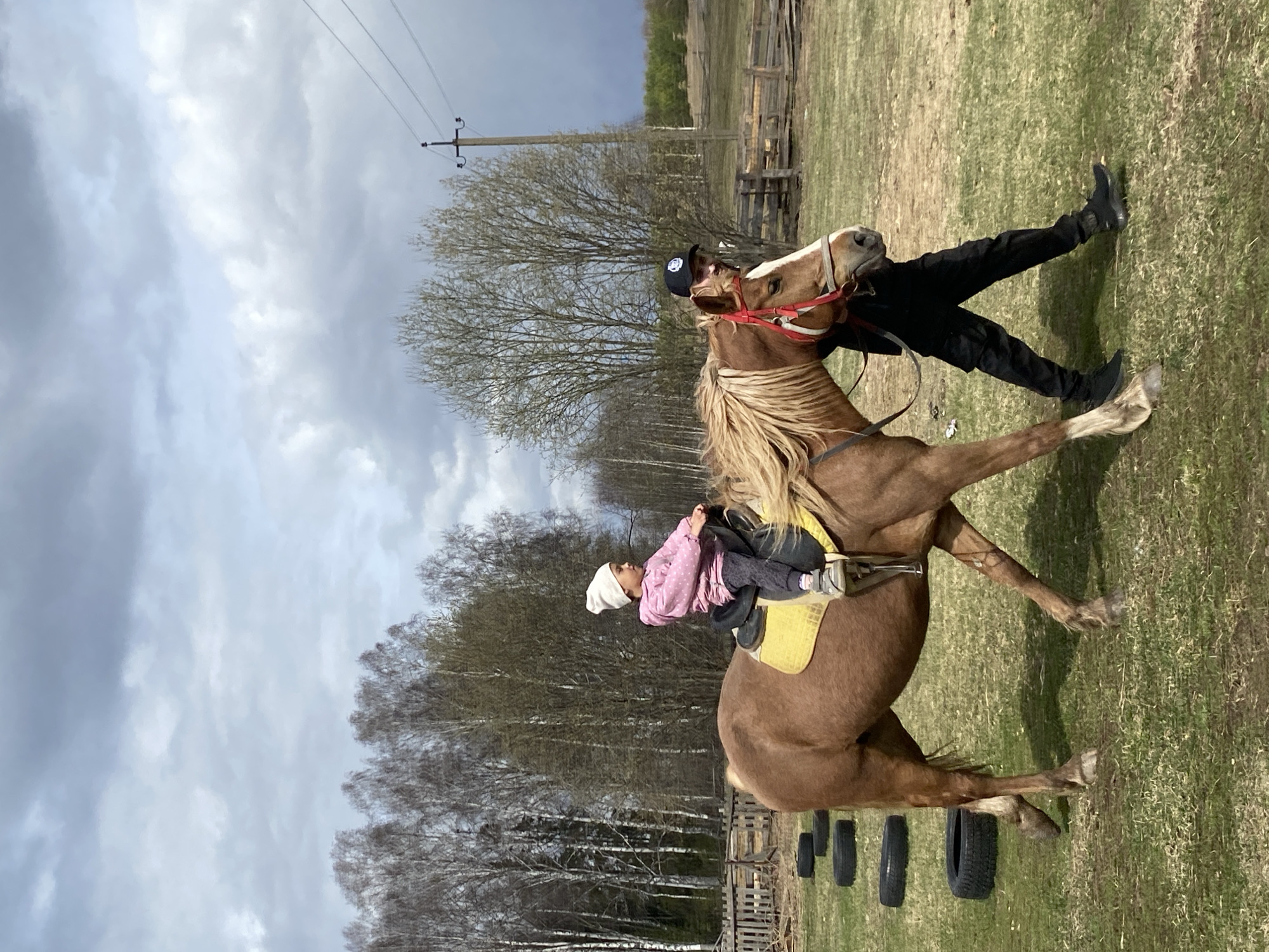 In Zhigalki, Russia, a child with a white beanie and pink jacket is riding a brown horse with a blonde mane in a grassy field. An adult in a black jacket and pants stands next to the horse, holding its bridle. In the background, there are trees, a cloudy sky, a utility pole, a wooden fence, and black tires. The grass is green and the sky is overcast.