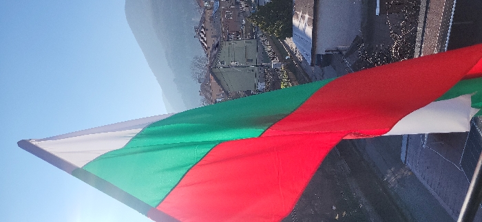 The image displays a Bulgarian flag prominently in the foreground, oriented vertically with the white, green, and red horizontal stripes visible from top to bottom