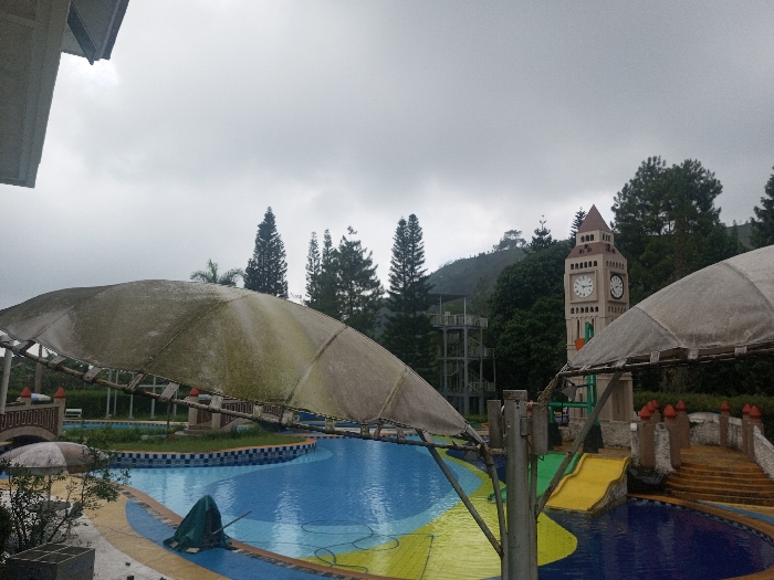 cloudy day at a water park. A large, tent-like structure covers part of a swimming pool. In the background, a replica of the Big Ben clock tower stands among trees. A metal tower is visible nearby. The pool has a winding shape and a yellow and blue design. A slide is next to the clock tower. The sky is overcast.