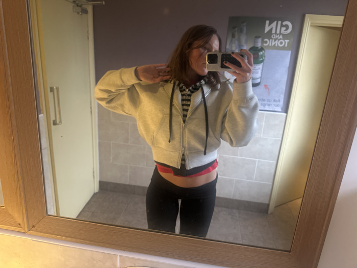 A mirror selfie depicts an individual in what appears to be a public washroom or similar facility in Weymouth, United Kingdom. The subject, a female with brown hair, is positioned centrally, holding a black smartphone with a light-colored case up to her face, obscuring part of it, to capture her reflection. She wears a grey cropped zippered hoodie over a black and white striped top, black leggings, and a visible red band, possibly from an undergarment, at her midriff. Her left hand, with dark nail polish, is raised towards her neck/shoulder area. The environment includes a large rectangular mirror with a light wooden frame, reflecting the scene. Behind the subject, the wall features light grey square tiles on the lower half and a plain light purple/grey color on the upper half. To the left of the subject's reflection (viewer's right), a light cream-colored door with a horizontal metal handle and a door-closer mechanism at the top is visible. To the right of the subject's reflection (viewer's left), a poster advertising "GIN AND TONIC," featuring a green bottle and text, is affixed to the upper wall. The floor is covered with dark grey square tiles. A light-colored counter or shelf is visible below the mirror frame.