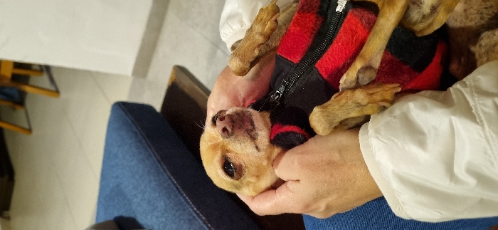 A small, tan Chihuahua wearing a red and black plaid jacket with a zipper lies upside down in someone's lap. The person cradles the dog's head with their hands. The background includes a blue chair cushion, a white table, and a wooden chair. The dog's eyes are open, and its nose is pink. The person is wearing a white shirt or jacket.
