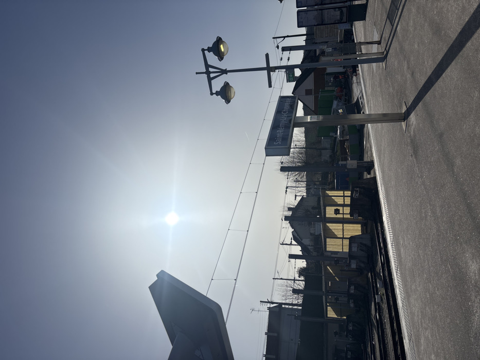 The image depicts a train station platform at Saint-Rémy-lès-Chevreuse, France, under bright, direct sunlight. The sky is clear and light blue, with a prominent sun flare originating from the upper-left quadrant. In the foreground, a dark grey asphalt or concrete platform extends from left to right, with multiple train tracks visible to its left. Concrete blocks are positioned alongside the tracks. A silver signpost centrally displays "Saint-Rémy-Lès-Chevreuse" in white text on a dark background. To the right of the sign, a dark lamppost features two illuminated luminaires, casting a distinct shadow towards the lower right. Further to the right, several vertical dark grey information boards or advertisements are partially visible. In the mid-ground, beyond the tracks, several single-story structures with yellow or light-colored siding are brightly illuminated by the sun. Overhead electrical lines (catenary) span across the scene. A grey, angled structure, possibly part of a station canopy or an overhead bridge, is visible in the upper-left corner. The background reveals residential buildings with sloped roofs, partially obscured by bare trees and utility poles. To the right, behind the platform, what appears to be a construction area is present, indicated by green barriers and disturbed earth. A single individual, possibly a worker in high-visibility attire, is discernible within this construction zone. No direct actions or interactions between individuals are clearly depicted, but the scene suggests active infrastructure.