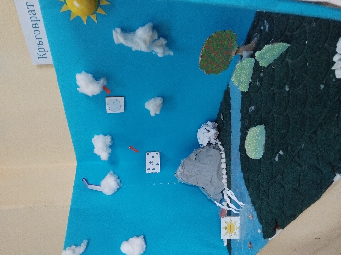 An indoor educational diorama, depicting the water cycle, is presented against a corner formed by two light blue walls within a building in Nova Zagora, Bulgaria