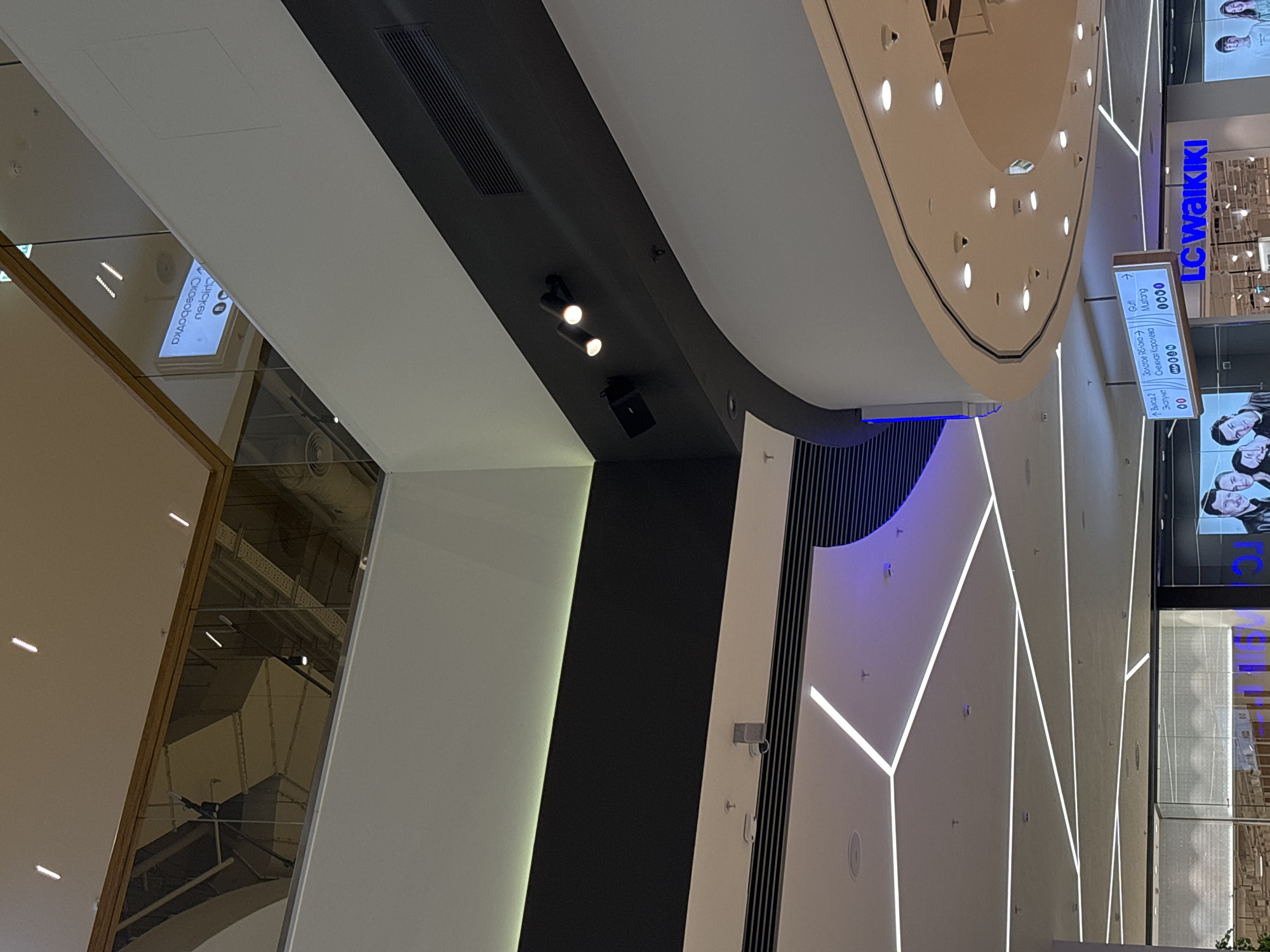This image depicts the interior of a shopping mall in Perm, Russia. The view is from a low angle, looking upwards toward the ceiling. The ceiling features a layered design with white, beige, and black sections. There are integrated lighting fixtures, including spotlights and illuminated linear elements. Signage indicating store names and directions is present, including "LC Waikiki" and a directional sign with "Gutl Mustang" on it. A store display with images of people is visible. Architectural details include a black vertical column and a white wall with geometric light patterns.