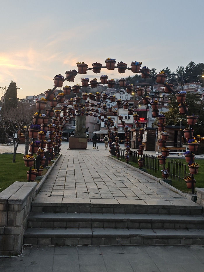 The image depicts a public pedestrian pathway in Ohrid, North Macedonia, at dusk or dawn. The scene is viewed from a low angle, looking up a slight incline. In the foreground, three grey stone steps ascend to a paved walkway constructed from light grey square pavers. This pathway extends towards the background, flanked by a curvilinear archway structure composed of numerous dark-colored poles supporting terracotta-colored flowerpots. These pots contain small flowering plants with yellow and purple blossoms. The structure creates an overhead arch extending along the path. To the left of the pathway, a low stone wall borders a grassy area containing several deciduous trees with bare branches. To the right, a short black metal fence separates the path from another grassy area and several small, light-colored wooden kiosks or structures. In the midground, centered on the pathway beyond the flowerpot arch, stands a large, dark statue or monument on a stone pedestal. Several individuals are visible on the paved pathway further in the midground: one person on the left is pushing a yellow electric scooter, while another individual walks immediately behind them. Other indistinct figures are present further in the background. The background features a densely built hillside with numerous multi-story buildings, predominantly white or light-colored, featuring red-tiled roofs. The hillside is partially covered with trees. The sky above is a gradient, transitioning from a warm orange-yellow on the left horizon to a pale blue-grey overhead, indicative of low light conditions. Several streetlights are visible, some illuminated, scattered throughout the background buildings. The specific location is identified as the area around Sveti Kliment Ohridski Square in Ohrid, North Macedonia.