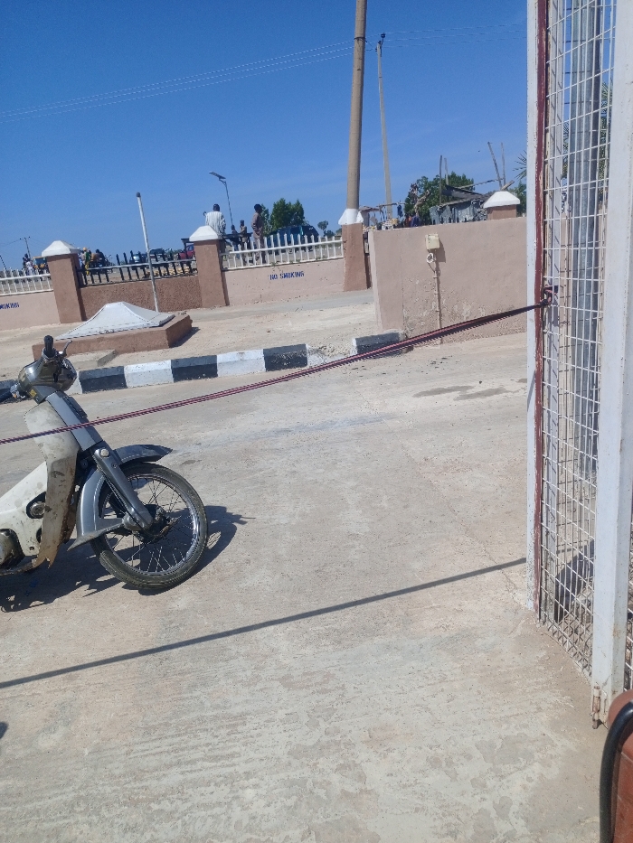 This image depicts an outdoor scene in Dutsinma B, Nigeria, under a clear blue sky with direct sunlight. In the foreground, the front section of a white or light-colored motorcycle, displaying its front wheel, fender, and lower engine area, is positioned on the left side of a concrete surface. A dark red or maroon rope is tautly stretched horizontally across the lower-mid frame, extending from an obscured point on the left towards a vertical white metal gate frame, characterized by square grid mesh, on the far right. In the midground, a low, light brown perimeter wall, topped with white decorative balusters, separates the foreground area from an inner space. The text "NO SMOKING" is visible in white lettering on at least two sections of this wall. Black and white striped curbs delineate the edge of the concrete surface adjacent to the wall. Behind the curbs and partially obscured by the wall, a dark, square-based structure with a pyramidal top is visible. Several individuals are present beyond this wall, standing and congregating. Some dark-colored vehicles are partially visible in the distance behind the individuals. The background features two prominent utility poles, with electrical lines spanning between them, set against a bright, cloudless blue sky. A smaller pole equipped with a solar panel and light fixture is also present. Sparse vegetation and a faint, rudimentary structure are discernible on the distant horizon line.