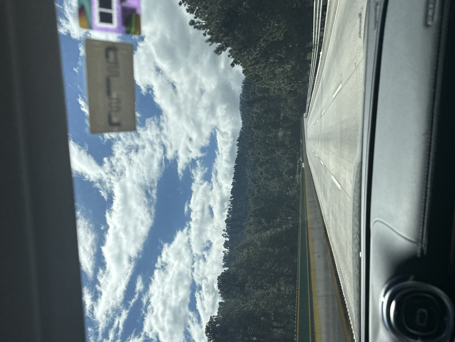 A view from inside a vehicle shows a bright blue sky filled with long, streaky white clouds. Next to the sky is a densely forested hillside. Parallel to the hillside is a concrete highway with multiple lanes, white lane markers, and a yellow median line. The interior of the car is visible on the right edge of the image. A permit hangs from the windshield in the upper left corner.