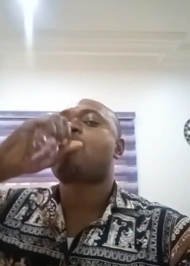 A man is video-recording himself. He appears to be bald, with a trimmed goatee. He is wearing a patterned button-down shirt. The man raises a small, clear glass object, tilting his head back to swallow the liquid inside. The background consists of white walls and a horizontally striped window blind. The lighting is bright, appearing to be from overhead.