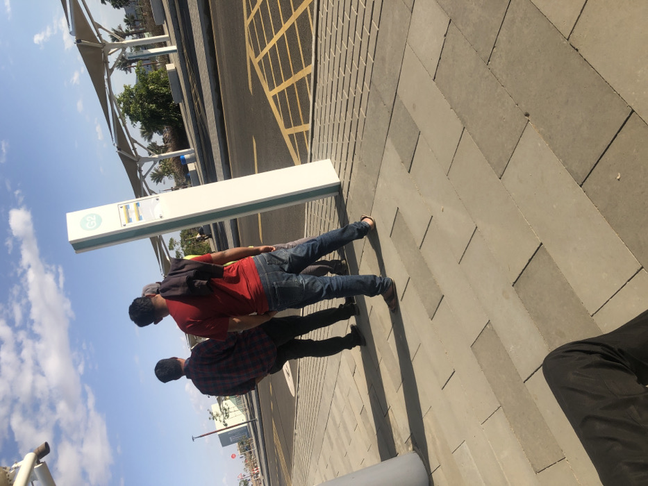 Two men stand at a bus stop. One wears a red shirt and jeans, and has a black jacket draped over his shoulder. The other man wears a red and black plaid shirt. They are near a bus stop sign and stand on a paved area. A yellow striped no-parking zone is visible. In the distance, there are buildings and a clear sky with a few clouds.