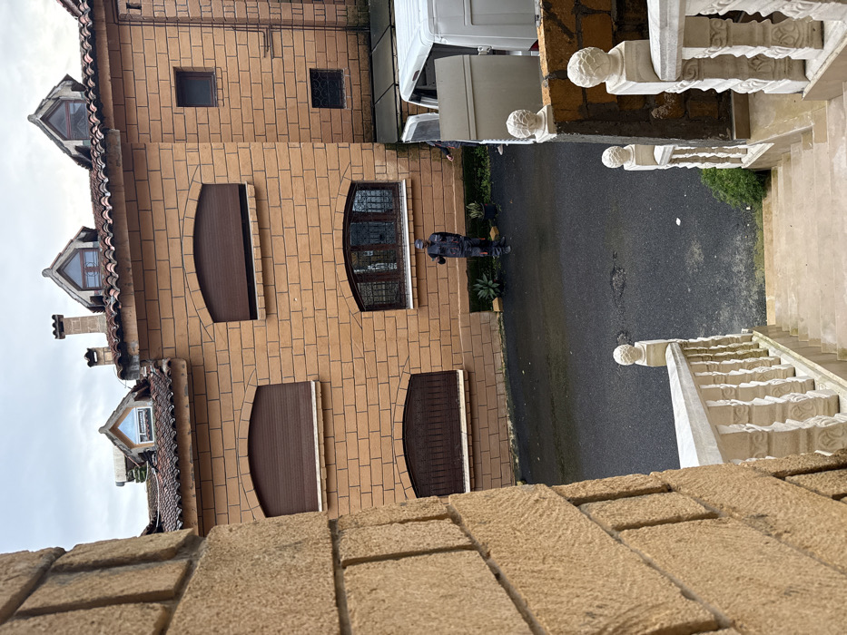 An overhead photograph captures a residential or commercial scene in Tangier, Morocco, under an overcast sky. The viewpoint is from a descending outdoor staircase, framed by a light brown stone wall on the left and a white stone balustrade with ornate newel posts on the right. Below the stairs, a dark asphalt surface, appearing wet in areas, extends towards a multi-story building. The distant building is constructed from light brown, rectangular brick-like material. It features multiple windows; several on the upper and lower floors are equipped with dark brown roller shutters. One window on the lower left has a dark brown arched frame with an ornate metal grille. The building is topped with a terracotta tiled roof, from which three dormer windows with pointed gables and two brick chimneys protrude. On the asphalt surface, two white utility vans are parked on the right side. The closer van's rear doors are open, revealing a dark interior and possibly a light-colored object within. Two individuals are visible. One male subject stands centrally on the asphalt, facing slightly towards the vans. He wears dark grey or blue work overalls with orange accents and a baseball cap. His right arm is raised, with his hand near his chest, possibly holding an object or gesturing. A second individual, partially obscured, is visible near the open rear doors of the closer white van, wearing a dark top, appearing to interact with the vehicle's interior. Small green plants in pots and ground cover are situated along the base of the distant building.