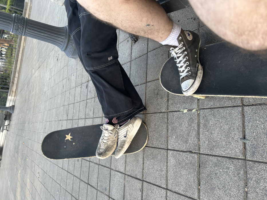 Two individuals stand on skateboards on a gray tiled surface. The first person wears black pants, white socks, and white sneakers. Their skateboard features a gold star and smaller gold circles. The second person wears a gray high-top Converse sneaker and white socks. A black post stands to the left of the scene. The composition shows the lower half of their bodies and skateboards, with the perspective angled from above.