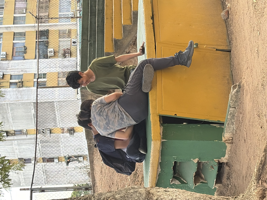 Three young males are situated outdoors in Guayana City, Venezuela. Two males are seated on a dilapidated concrete structure, painted green and yellow, with a third male partially obscured to the left. The male on the right wears an olive green t-shirt and black high-top sneakers, smiling and looking left. The male in the center wears a camouflage t-shirt and dark pants with black sneakers, his back mostly to the viewer, with his legs dangling over the edge of the structure. The male on the left is largely obscured, wearing a dark shirt and pants, with a black backpack resting beside him. The concrete structure is green on its left section, displaying three rectangular openings with broken slats. The right section is yellow, featuring two vertical panels, one slightly ajar. The ground is dry, reddish-brown earth. To the right, green and yellow concrete steps ascend. In the background, beyond a chain-link fence, stand multiple multi-story concrete residential buildings exhibiting significant deterioration, discolored facades, and numerous external air conditioning units. Some windows are open or appear damaged. The overall scene suggests an urban public area in a state of disrepair.