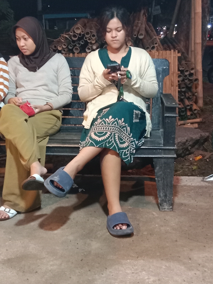 - "Two young adult females are seated on a dark-colored bench outdoors at night in Sekopek Wetan, Indonesia" by FM-xHTx62, licensed under CC BY 4.0