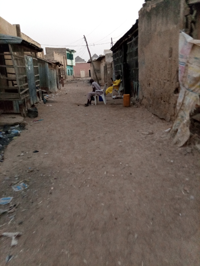 A dirt road stretches between closely built structures, many appearing weathered and some constructed from corrugated metal. A man in light-colored attire sits on a plastic chair, while another figure in yellow is seated behind him. An orange container rests nearby. Debris and litter are scattered along the roadside. Utility lines run above, contrasting with the rudimentary architecture. A child is walking in the distance.
