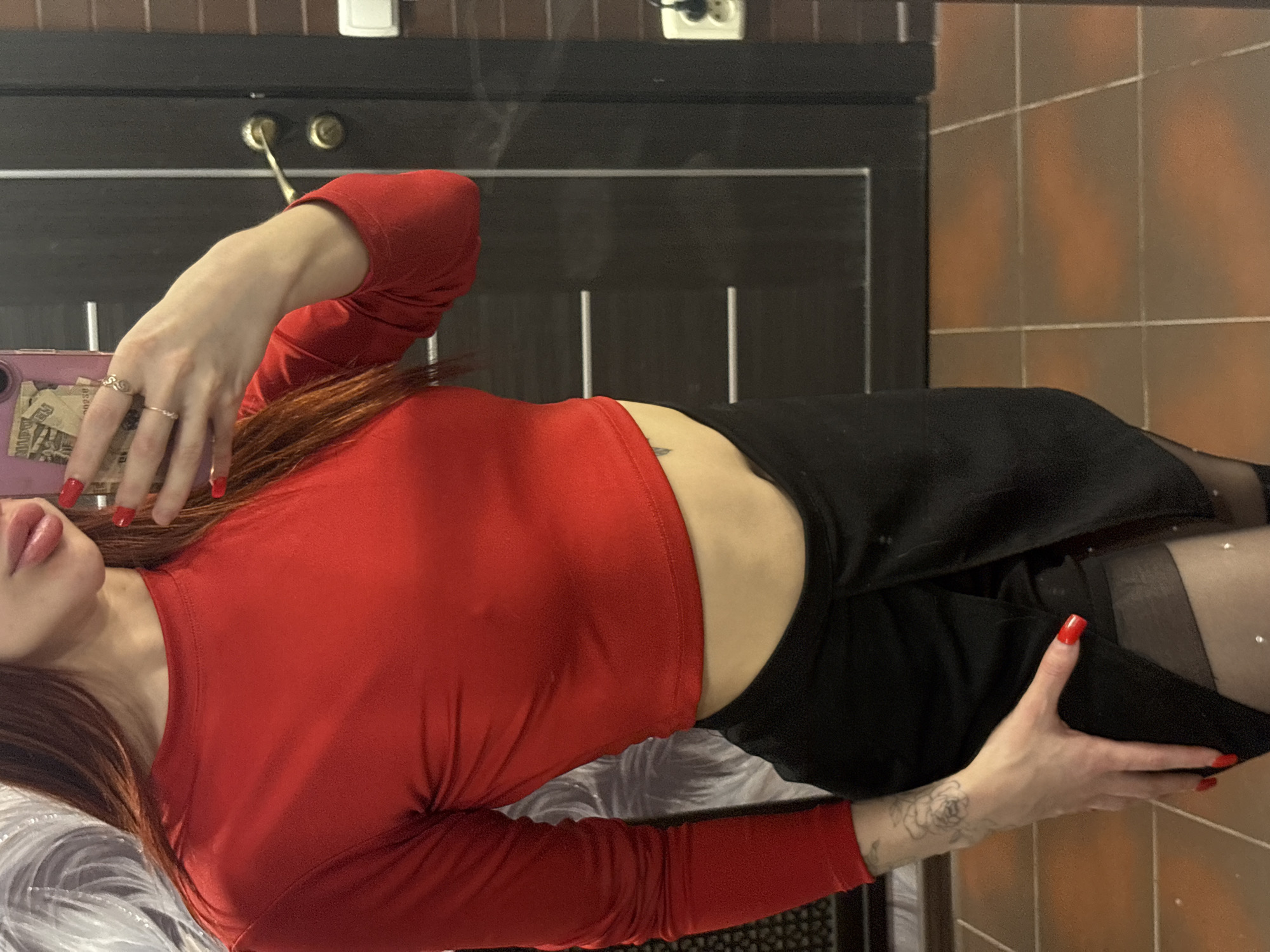 A woman with long red hair, wearing a red long-sleeved shirt and a black skirt, is taking a selfie in a room with tiled walls and a dark wooden cabinet
