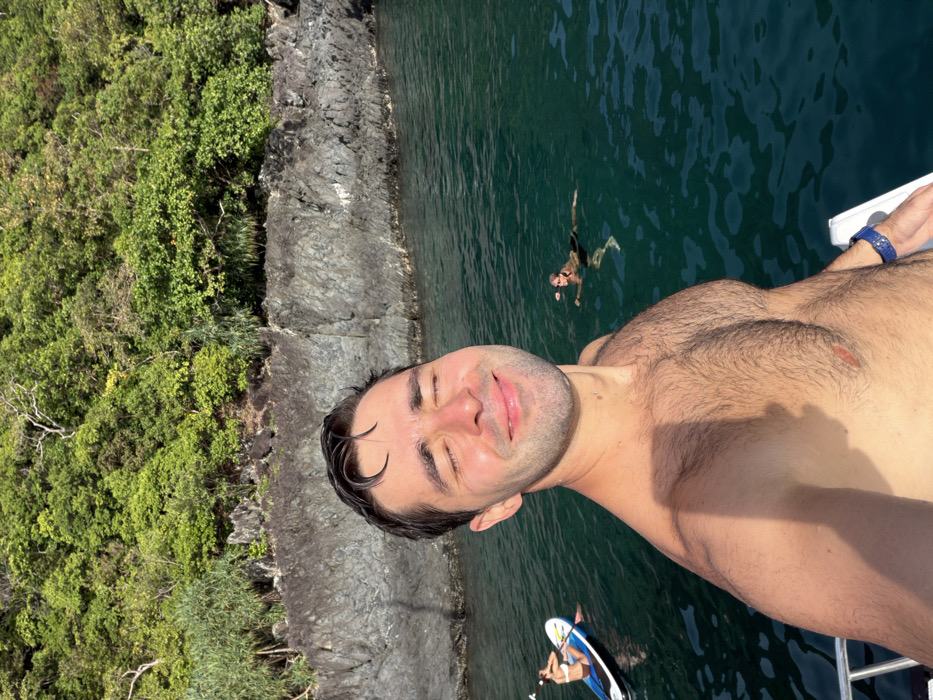 A bare-chested male, with wet dark hair and a blue wrist-watch, smiles with closed eyes while taking a selfie from a boat in the waters off Rawai, Thailand