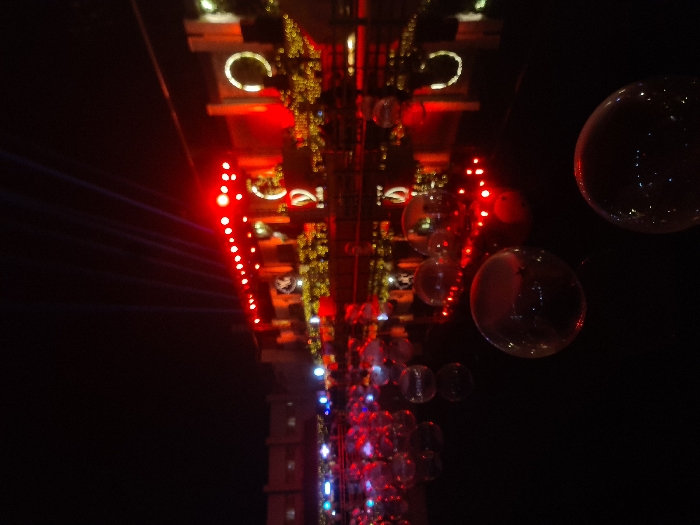 A dark, vertically-oriented image showcases an illuminated structure, possibly a building or tower, reflected as if in water. Red and gold lights adorn the structure, along with distinct circular elements. A series of illuminated spheres, resembling bubbles, float in the darkness to the right, contrasting with the geometric lines of the reflected edifice. Laser beams emanate from the left side of the image. The overall scene evokes a nighttime urban landscape or festive display.
