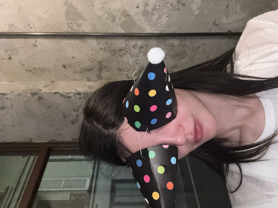 A young female, likely an adult, is depicted in a medium shot, positioned indoors in what appears to be a Parisian residence. She has long, dark hair and wears a white t-shirt. Her eyes are obscured by two modified black, conical party hat-like objects, each decorated with multi-colored polka dots (pink, green, orange, yellow, blue, light green). These objects are connected and held in place by a thin, light-colored elastic string across the bridge of her nose. The cone covering her right eye (viewer's left) features a small white pom-pom at its tip. Her lips are slightly parted. The background to her left shows a dark-framed window revealing an exterior building with a window fitted with white louvered shutters, consistent with Parisian architecture. To her right, a textured, light grey wall displays signs of wear, alongside a vertical metallic pipe or conduit.