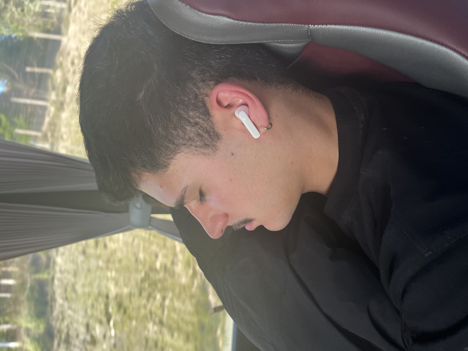A male individual is observed in profile, facing left, situated within the interior of a vehicle. His eyes are closed, consistent with sleep or rest. He has dark, short hair and a prominent mustache. A white wireless earbud is present in his right ear, accompanied by a small gold hoop earring in the earlobe. He is dressed in a dark, likely black, long-sleeved top, with an additional black garment or jacket bunched to his front and left. Behind him is a red-brown upholstered vehicle seat. To his left, a window with light-toned curtains reveals a blurred outdoor landscape composed of green and brown vegetation with distant trees, indicative of movement. The precise location within Amarante, Portugal, cannot be ascertained from the visual evidence.
