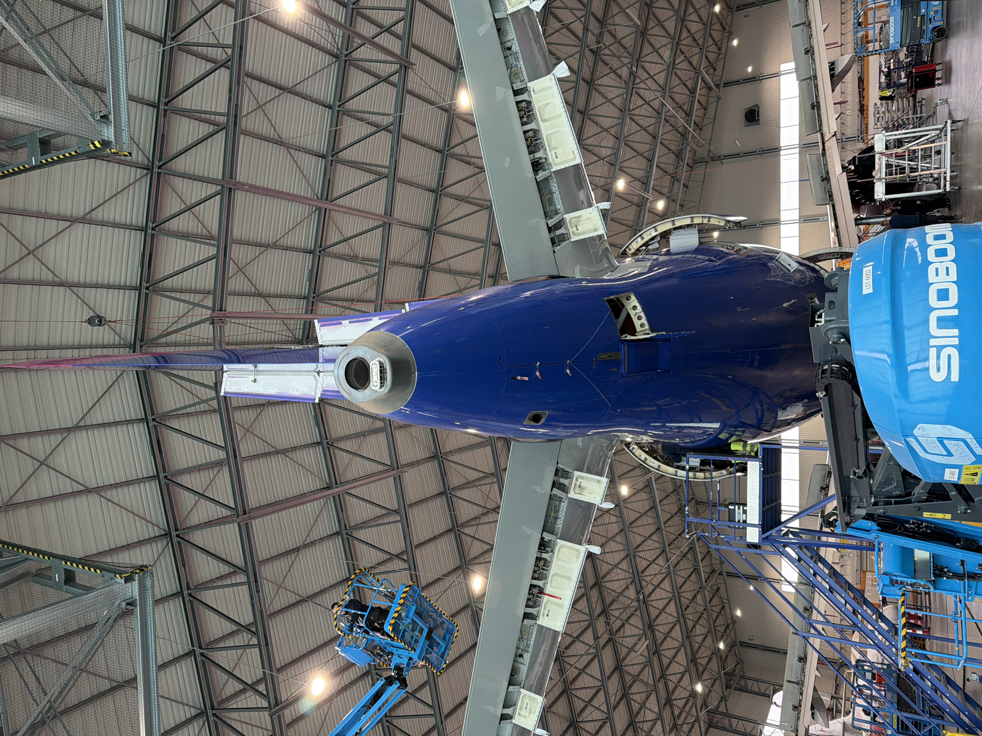 A large blue wide-body passenger aircraft undergoing maintenance is situated within an aircraft hangar in Gdańsk, Poland. The image focuses on the aircraft's rear section, displaying a dark blue fuselage, grey wings with multiple open access panels on the underside, and a vertical stabilizer featuring purple and pink accents. A circular exhaust port, likely for an auxiliary power unit (APU), is visible at the tailcone. On the left, a technician, dressed in dark clothing, operates a blue Sinoboom aerial work platform (scissor lift) positioned near the aircraft's left wing. The base unit of a large blue Sinoboom ground support equipment is prominent in the lower right foreground. A multi-level blue metal stairway and access platform is affixed to the right side of the aircraft's fuselage, where another individual is partially visible. The hangar ceiling consists of extensive metal trusswork supporting corrugated panels and is brightly lit by numerous industrial fixtures. A grey mesh safety net and a yellow-and-black striped protective barrier are visible suspended from the upper ceiling structure on the left. Additional maintenance tools and equipment are present on the hangar floor in the background.