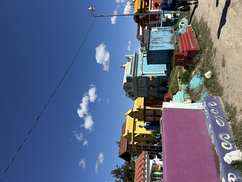 A vibrant cemetery under a bright blue sky with scattered clouds is depicted. Colorful tombs and mausoleums in hues of yellow, blue, purple, and red are arranged along a path. A utility pole with a speaker stands tall, wires stretching across the sky. Grass grows beside the pathway, casting shadows. A person walks along the edge of the cemetery.