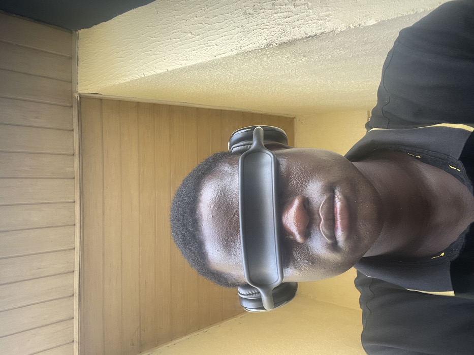 A male individual is depicted in a low-angle, close-up shot, positioned in Ado, Nigeria. He wears a black polo shirt with yellow trim and a dark, opaque visor device that completely covers his eyes. This visor appears integrated with or attached to black over-ear headphones. The individual's face is directed towards the viewer, exhibiting a neutral expression, with visible sheen on the skin of his forehead and nose. The immediate background consists of a light yellow, textured wall to the right and a horizontal wooden-paneled soffit or ceiling structure directly overhead. The lighting is consistent and bright.