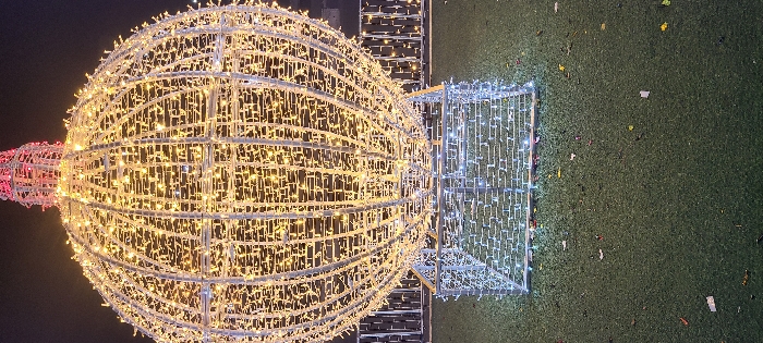 A spherical light display dominates the frame, emitting a warm, yellow glow