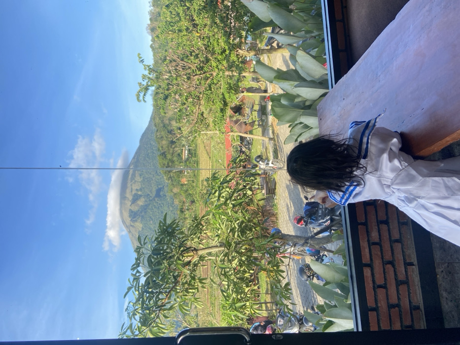 A young child, observed from behind, with dark hair and wearing a white dress featuring a blue and white striped sailor collar, sits at a light brown wooden table, looking out through a large glass window. The interior reveals a dark brick wall section beneath the window. Outside, a paved area serves as a parking lot for several motorcycles, some with helmets, including one motorcycle with the license plate "L 5581 AD." This area is bordered by green foliage, including large-leafed plants directly outside the window and a small tree. Beyond the parking lot, agricultural fields, likely terraced, lead to densely vegetated hills. A prominent green mountain, possibly Mount Penanggungan, with a white cloud resting near its summit, dominates the distant horizon under a clear blue sky with minimal cloud cover. The scene is brightly lit by daylight in Penanggungan, Indonesia.